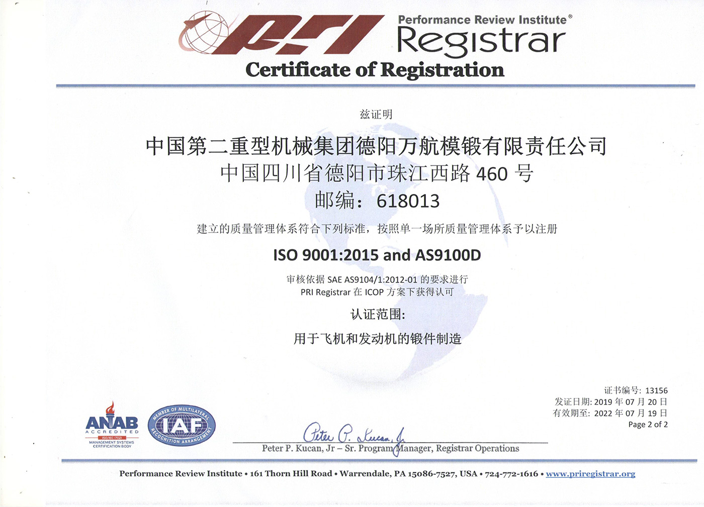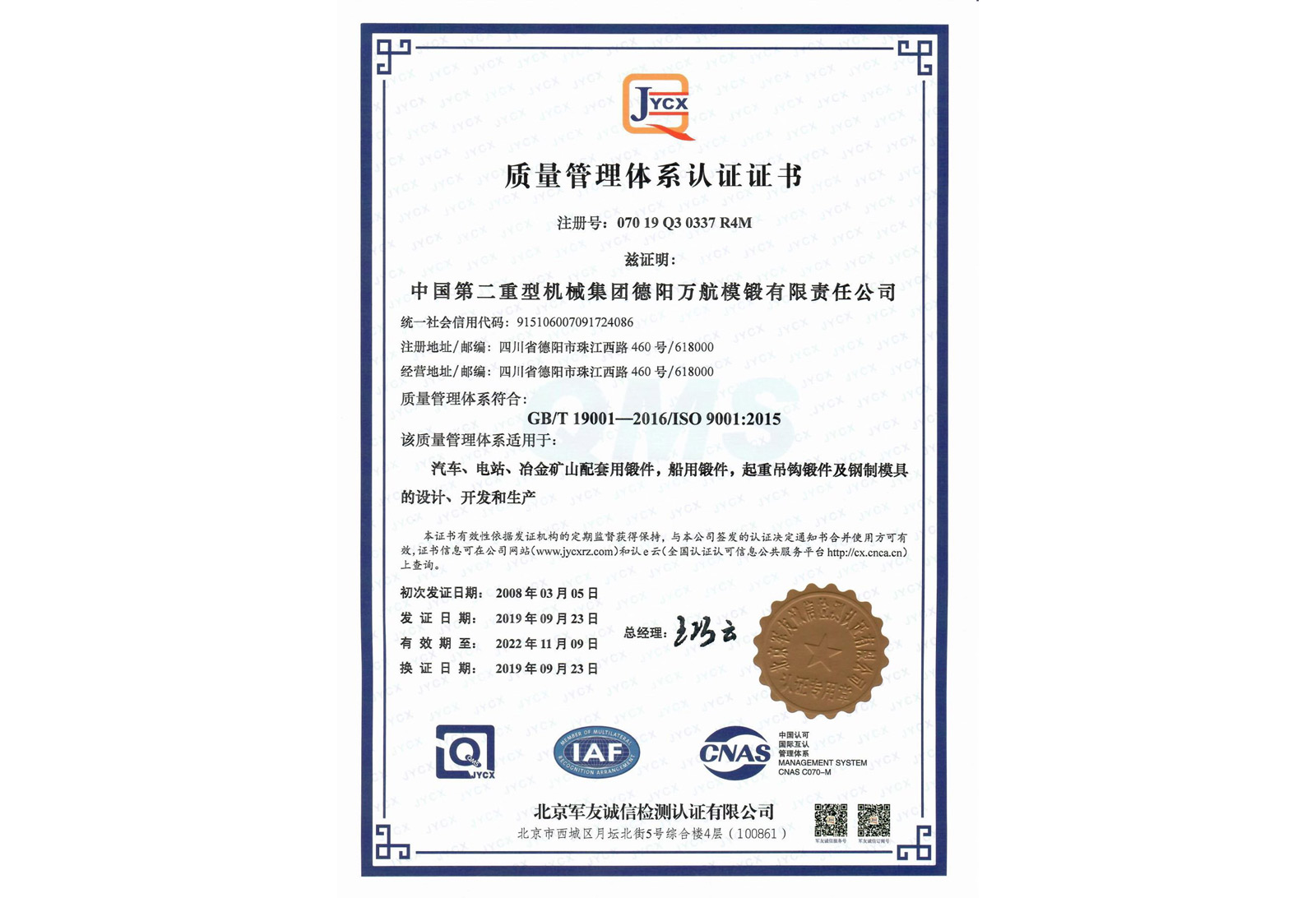 中國第二重型機械集團德陽萬航模鍛有限責任公司(以下簡稱“萬航模鍛”)是世界500強之一的中國機械工業(yè)集團有限公司旗下中國第二重型機械集團有限公司與中國航空工業(yè)集團公司共同持股的有限責任公司。 萬航模鍛集科研、設計、生產(chǎn)、經(jīng)營于一體,以研制生產(chǎn)航空鍛件為主導產(chǎn)品,產(chǎn)品覆蓋航空、航天、能源、艦船動力、鐵路、汽車、起重等行業(yè)。在產(chǎn)品鍛造設計、技術(shù)工藝、熱處理、理化檢驗及模具加工制造等方面,具有國內(nèi)領先的優(yōu)勢。產(chǎn)品研制主要包括:鈦合金、超強鋼和結(jié)構(gòu)鋼、高溫合金、鋁合金。公司可制造各類大型模鍛件、大型模具以及模鍛件粗加工和成臺套機械產(chǎn)品,可完成各種類型的熱處理和表面處理工藝。可制造的大型模具單重為100T,大型軸類模鍛件長度可達6.5m,圓形模鍛件直徑可達2.5m。 面向新時代,萬航模鍛將不忘初心,繼續(xù)前進,不斷推進高端產(chǎn)品和前沿技術(shù)的產(chǎn)業(yè)化,著力打造世界一流航空模鍛件供應商。企業(yè)資質(zhì)