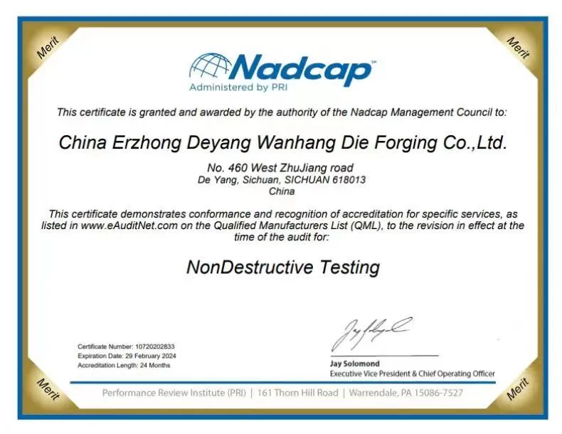 近日,萬航模鍛以書面“零”不符合項(xiàng)的優(yōu)異成績(jī),順利通過NDT(無損檢測(cè))專業(yè)Nadcap認(rèn)證審核,再次獲得金牌證書。這是萬航模鍛繼2019年現(xiàn)場(chǎng)審核“零”不符合項(xiàng)后,獲得的又一次褒獎(jiǎng),意味著再次獲得延期24個(gè)月的審核周期獎(jiǎng)勵(lì)。