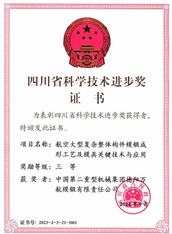 9月10日,在成都舉行的四川省科技大會(huì)傳來(lái)喜訊,萬(wàn)航模鍛兩項(xiàng)科技成果分獲四川省科學(xué)技術(shù)進(jìn)步獎(jiǎng)一等獎(jiǎng)、三等獎(jiǎng)。公司獲獎(jiǎng)代表上臺(tái)領(lǐng)獎(jiǎng)。