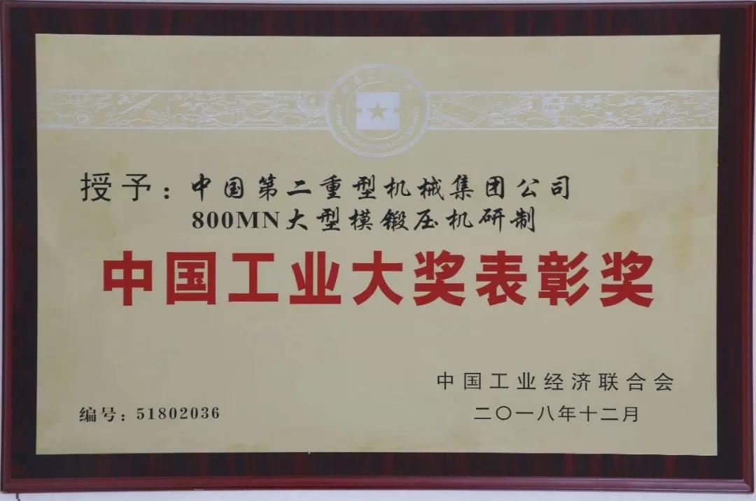 中國(guó)第二重型機(jī)械集團(tuán)有限公司(以下簡(jiǎn)稱“中國(guó)二重”)的800MN大型模鍛壓機(jī)(8萬(wàn)噸模鍛壓力機(jī))研制項(xiàng)目獲得“中國(guó)工業(yè)大獎(jiǎng)表彰獎(jiǎng)”。